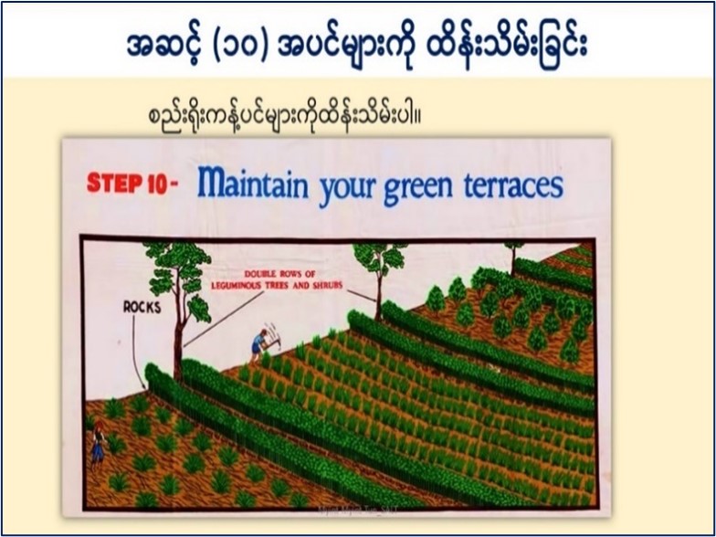 အချုပ်အားဖြင့်ဆိုသော် တောင်စောင်းဒေသ လူဦးရေထူထပ်လာ၍ မြေယာအသုံးချမှု တိုးပွား လာခြင်း၊ မြေယာပျက်စီးပြုန်းတီးမှု၊ ရေရှည်စိုက်ပျိုးနည်းစနစ်များ အသုံးပြုမှုနည်းပါးခြင်း၊ ပြင်ပသွင်းအားစု များကိုအားပေးမှုများပြားခြင်း၊ နည်းပညာဖြန့်ဝေနိုင်မှုအခက်အခဲတို့ကြောင့် တောင် ပေါ်ဒေသများတွင် မြေဆီလွှာပြုန်းတီးများ ကြုံတွေ့နေရပါသည်။ အဆိုပါအခက်အခဲများကို ကျော်လွှားရန်နှင့် ရေရှည်တောင်ပေါ်မြေဆီလွှာထိန်းသိမ်းရန်အတွက် ပြန်လည်ပြည့်ဖြိုးမြဲ စိုက်နည်းစနစ်များနှင့် သဘာဝအရင်းအမြစ်များကို အခြေခံသည့်စိုက်ပျိုးနည်းစနစ်နှင့် ရေရှည်မြေယာအသုံးချမှုစနစ်များကို အသုံးပြုရန်လိုအပ်ပါကြောင်း ဖော်ပြအပ်ပါတယ်ရှင်။