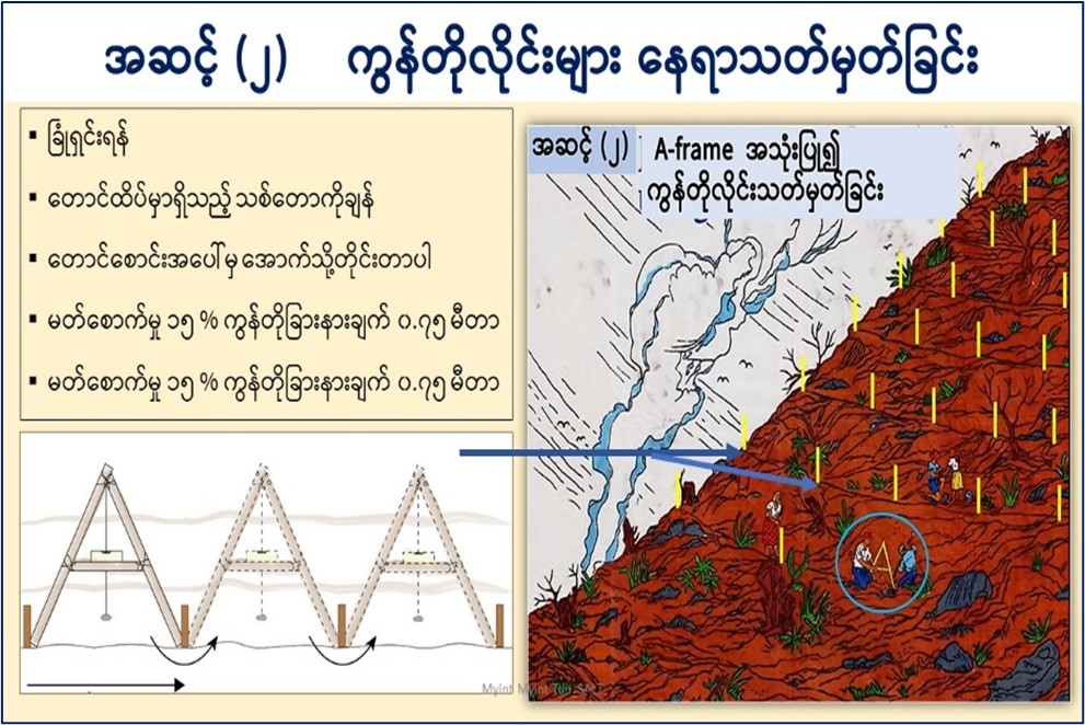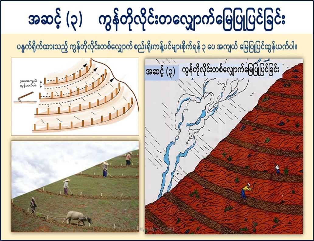 ကွန်တိုလိုင်းဆိုသည်မှာ ကုန်းမြင့်ဆင်ခြေလျောများတွင် အမြင့်တူသည့် အမှတ်များကို ဆက်ထားသောလိုင်းဖြစ်ပါသည်။ မှန်ကန်တိကျရန်လိုအပ်ပြီး မှားယွင်းပါက မြေဆီလွှာတိုက်စားခြင်းကို ပိုမိုဖြစ်ပေါ်စေနိုင် သည်။ ပထမဦးစွာ ကွန်တိုလိုင်းရှာဖွေရမည်ဖြစ်ပြီး ကွန်တို အမှတ်သားများ ပြုလုပ်ရန်နှင့် အေဖရိန်ရွှေ့ရာတွင် လွယ်ကူစေရန် ပေါင်းမြက်များ၊ ခြုံပင်များကို ရှင်းလင်းရမည်။ အေဖရိန်ရွှေ့ရန် လူ ၁ ဦးနှင့် တုတ်ချောင်းကိုအသုံးပြု၍ ကွန်တိုအမှတ် အသားမှတ်ရန် လူ ၂ ဦး လိုအပ်ပါမည်။ ကွန်တိုလိုင်းများသတ်မှတ်ရာတွင်တောင်စောင်းစိုက်ခင်း၏အမြင့်ဆုံးနေရာမှ စတင် ဆောင်ရွက်ရပါမည်။ အေဖရိန်အားမြေပေါ်တွင် ငြိမ်အောင်ထားရပါမည်။ အေဖရိန်၏ နောက်ခြေထောက်ကိုမရွှေ့ဘဲ ရှေ့ခြေထောက်ကိုမရွှေ့ပြီး မြေ ပေါ်တွင်ထားလိုက်ပါက နောက်ခြေထောက်နှင့် Levelညီသွားမည် ဖြစ်ပါသည်။ အေဖရိန်လိုင်းသည် ရေပြင်ညီလိုင်းဖြစ်ပါသည်။ အေဖရိန် ခြေ ထောက်၂ ခုကြားအလယ်တန်းပေါ်ရှိ လက်သမားရေချိန်၏ လေဟာနယ်သည် အလယ်တည့် တည့်အမှတ်တွင်ရပ်သွားပါက အေဖရိန်၏ ခြေထောက် ၂ ချောင်းသည် ရေပြင်ညီနေပါသည်။ ခြေထောက် ၂ ခု ကျသည့်နေရာတွင် ကွန်တိုအမှတ်အသားများအား တုတ်ချောင်းရိုက်၍ မှတ်သားရပါမည်။ အေဖရိန်၏ နောက်ခြေထောက်အား အရင်အေဖရိန်၏ ရှေ့ခြေထောက်ကျ သည့် နေရာနှင့်တထပ်တည်းထား၍ အေဖရိန်အား ရှေ့သို့ရွှေ့ပါ။ အေဖရိန်၏ ရှေ့ခြေထောက်အား နောက်ခြေထောက်နှင့် Levelညီအောင် ညှိပါ။ (၂-၃)ပေ အကွာတိုင်းတွင် ကွန်တိုလိုင်း အမှတ်အသားများ တွေ့ရမည်ဖြစ်ပါသည်။ ဤနည်းအတိုင်း တောင်စောင်းစိုက်ခင်းတစ်ခုလုံးအား ကွန်တို လိုင်းများ သတ်မှတ်ပါ။