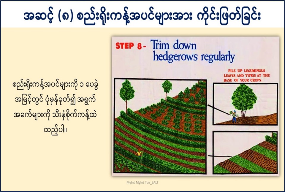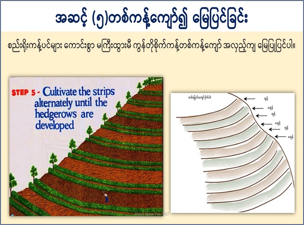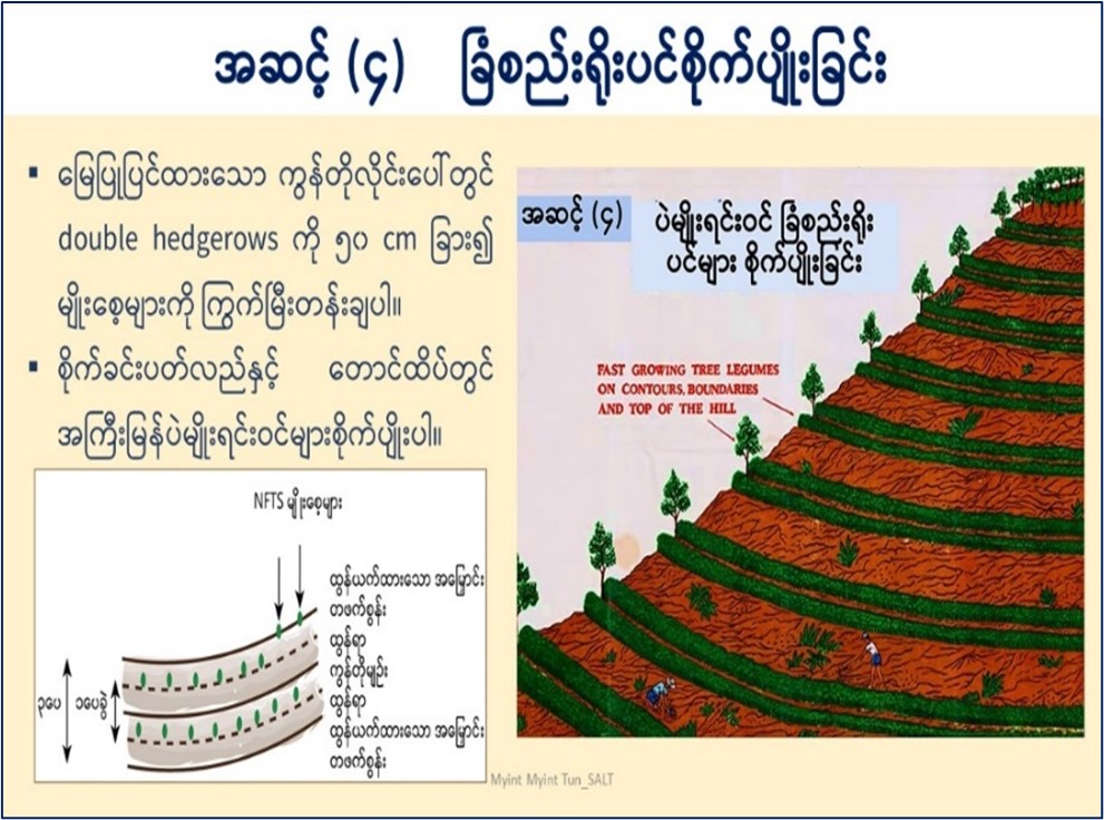အစားအစာဖူလုံစေပြီး အပိုဝင်ငွေရစေခြင်းထက် SALT စနစ်ကို ဆောင်ရွက်ခြင်း၏ ပို၍ အရေးပါသည့် အကျိုးကျေးဇူးမှာ (၂)တန်းထပ် နိုက်ထရိုဂျင်ဖမ်းယူပေးနိုင်သည့် စည်းရိုးကန့်ပင် များကို ကွန်တိုအလိုက်စိုက်ပျိုးခြင်းနှင့် လှေကားထစ်စိုက်ခင်းများ ဖြစ်ပေါ်လာခြင်းတို့ကြောင့် မြေဆီလွှာတိုက်စားခြင်းကို ထိန်းသိမ်းနိုင်ခြင်းဖြစ်ပါသည်။ လှေကားထစ်စိုက်ခင်းများ ဖြစ်ပေါ် လာပြီးနောက် သီးနှံအကြွင်းအကျန်၊ ရိုးပြတ်များ၊ အရွက်များ၊ ကိုင်းများ၊ ကျောက်တုံးနှင့် ကျောက်ခဲများအား စည်းရိုးကန့်အပင်များ၏ အောက် ခြေတွင်ထားပေးပါ။ ထိုသို့ပုံမှန်လုပ်ဆောင် ပေးခြင်းအားဖြင့် အချိန် ကြာမြင့် လာသည့်အခါ တောင်စောင်းစိုက်ခင်းများ၏ အဖိုးတန်မြေများကို မြဲမြန်စွာ၊ သဘာဝ အတိုင်း အစိမ်းရောင်လှပသည့် လှေကားထစ်များကို တည်ဆောက်ပြီးသား ဖြစ်လာပါလိမ့်မည်။