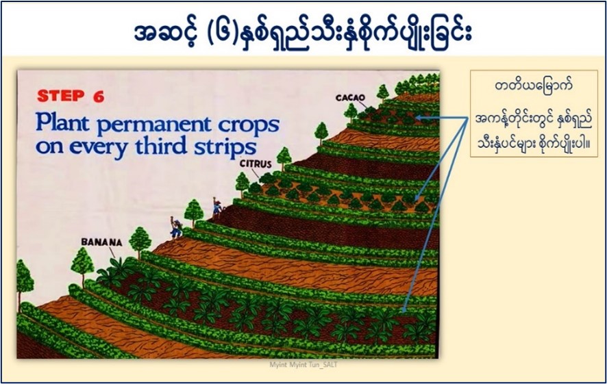 နိုက်ထရိုဂျင်ဖမ်းယူပေးသည့် စည်းရိုးကန့်ပင်များနှင့် တစ်ပြိုင် တည်း နှစ်ရှည်သီးနှံပင်များကို စိုက်ပျိုးရပါမည်။ နှစ်ရှည်သီးနှံများကိုရွေးချယ်ရာ ရေမြေဒေသရာသီဥတု၊ ဈေးကွက် အပေါ်မူတည်၍ ရွေးချယ်စိုက်ပျိုးပါ။ နှစ်ရှည်စိုက်ပျိုးမည့် နေရာအားကွက်၍ မြေပြင်ခြင်း၊ ပေါင်းရှင်းခြင်း ဆောင် ရွက်ပါ။ နှစ်ရှည်သီးနှံပင်များအား စိုက်ခင်း၏ တတိမြောက်အကန့်တိုင်းတွင် စိုက်ပျိုးပါ။ ကော်ဖီ၊ ငှက်ပျော၊ ရှောက်၊ သင်္ဘောနှင့် အခြားအပင်အမြင့်တူသော သီးနှံများကို နှစ်ရှည်သီးနှံများအဖြစ်စိုက်ပျိုးပါ။ အပင်မြင့်သည့်သီးနှံများကို တောင်စောင်း၏ အောက်ခြေ အနိမ့် ပိုင်းတွင်စိုက်ပျိုး၍ အပင်အရပ်နိမ့်သောသီးနှံများကို တောင်စောင်းအပေါ်ပိုင်းတွင် စိုက်ပျိုးပါ။