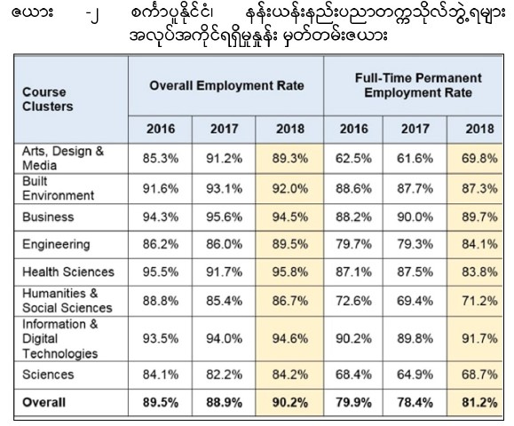 (၄-က) ဘွဲ့ရအလုပ်အကိုင်ရရှိမှုနှုန်း (Graduate employment rate) ဘွဲ့ရပြီး ၆လ မှ ၁၂ လအကြာ (6 months and 12 months after Graduation) — ရည်မှန်းချက်ရာခိုင်နှုန်း (Target: 75% within 12 months) (သို့) ဆက်စပ်အကြောင်းအရာရည်မှန်းချက်များ (Context-sensitive target).    နမူနာအားဖြင့် စင်္ကာပူနိုင်ငံ၊ နန်းယန်းနည်းပညာ တက္က သိုလ် (NTU - Nanyang Technological University) မှစစ်တမ်းကောက်၊ သုတေသ န ပြုထားသော ထိုတက္ကသိုလ်ဘွဲ့ရများ၏ အလုပ်အကိုင်ရရှိမှုရာခိုင်နှုန်းကို