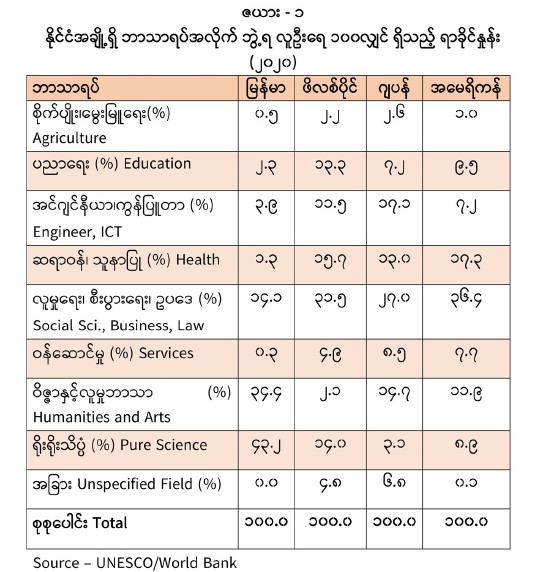 ထပ်မံပြီး စာရေးသူကြုံတွေ့ခဲ့ရသော နိုင်ငံတကာတက္ကသိုလ် ဘွဲ့ရများနှင့် ယနေ့ခေတ် အလုပ်အကိုင်ရရှိမှု အခွင့်အလမ်းများ၏ အခန်းကဏ္ဍကို ဆွေးနွေးပါမည်။ယခင် ဆောင်းပါး တွင် နိုင်ငံအချို့ မိမိနိုင်ငံအတွင်းရှိ တက္ကသိုလ်အားလုံး၏ ဘွဲ့ရ ၁၀၀ ဦးတွင် လက်ရှိ ဖြစ်ပေါ်နေသော ဘာသာရပ်/ဘာသာခွဲအလိုက် (Specific Disciplines/ Specialization) ဘွဲ့ရရာခိုင်နှုန်း၊ အချိုးများကို တင်ပြဆွေးနွေးခဲ့ပါသည်။ဘွဲ့ရဦးရေ ၁၀၀လျှင် စိုက်ပျိုးမွေးမြူရေးဘွဲ့ရ အချိုးမှာ မြန်မာနိုင်ငံကအနည်းဆုံးဖြစ်နေသည်ကိုတွေ့ရပါသည်။