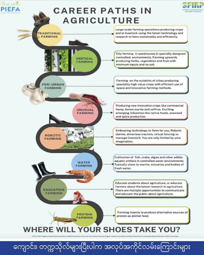အလုပ်အကိုင်လမ်းကြောင်း (Career Pathways) များသို့ ပြင်ဆင်ပေးခြင်း။ ဥပမာ - စိုက်ပျိုးစီးပွားရေး (Agribusiness)၊ မွေးမြူရေးသိပ္ပံ (Animal Science)၊ အပင်သိပ္ပံ (Plant Science)၊ ပတ်ဝန်းကျင်သိပ္ပံ (Environmental Science)၊ စိုက်ပျိုးရေး အင်ဂျင်နီယာ (Agricultural Engineering) ပညာများဖြင့် ကျေးလက်လူထုအဖွဲ့အစည်း (Rural Communities) အတွက် အနာဂတ် စိုက်ပျိုးမွေးမြူရေး ပညာရှင်များ ပြုစုပျိုး ထောင်ပေးပါသည်။
