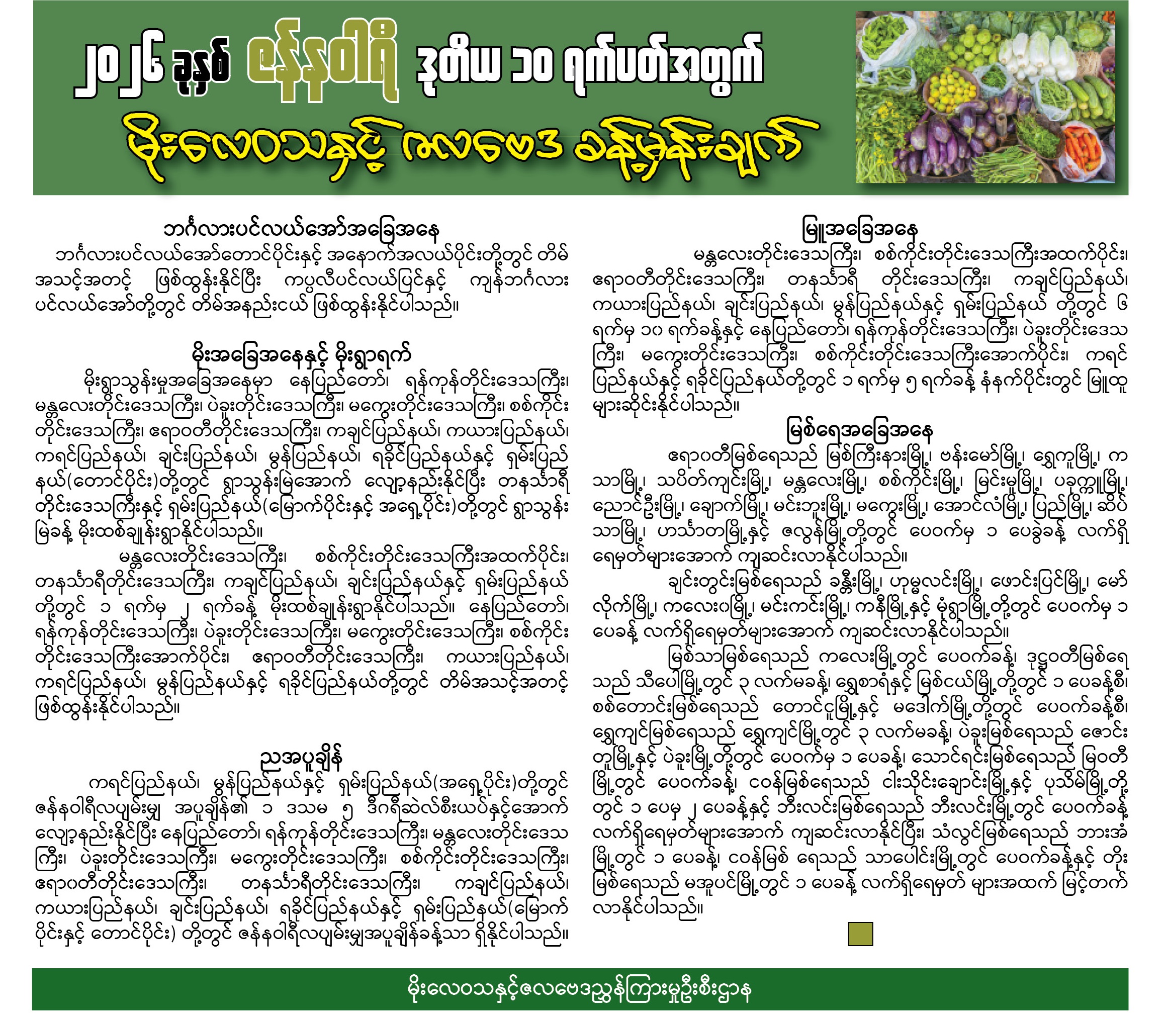 မန္တလေးပွဲစားကုန်သည် စက်ပိုင်ကထိန်တော်အသင်း၊ ကိုင်းတန်းဈေး၊ သီရိမာလာဈေးတို့မှ ၁၂-၁-၂၀၂၆ ရက်နေ့ ကောက်ယူဈေးနှုန်းများဖြစ်ပါသည်။